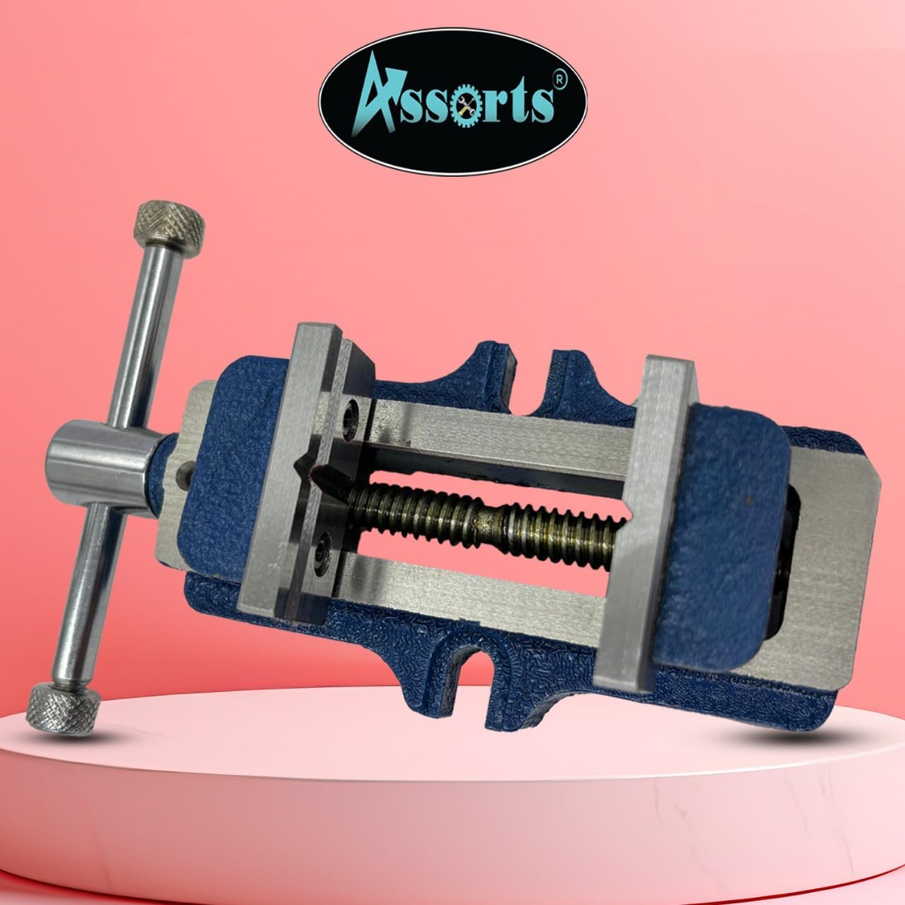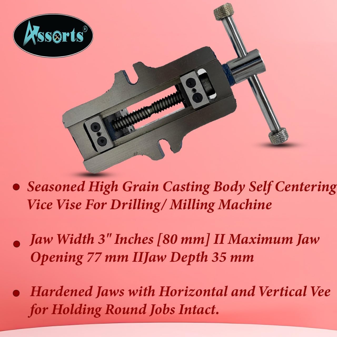 The ASSORTS Self-Centering Vice is a strong tool with 3-inch (80mm) wide jaws. These jaws are made from tough tool steel, which means they’re extra hard and precisely shaped for a great grip. This vice is built to last and will hold your work securely in the center.