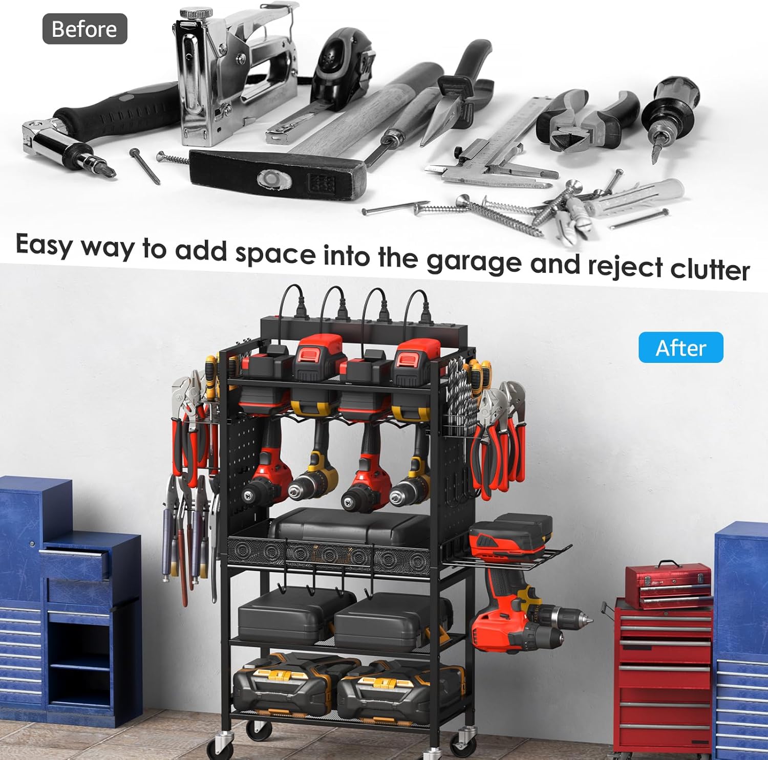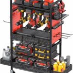 This CCCEI Power Tool Organizer Cart is a handy, mobile storage solution for your garage or workshop. It’s a rolling cart on wheels that helps you keep your power tools neat and tidy. The cart can hold up to six drills and also has a built-in charging station with a power strip so you can easily charge your tool batteries. It’s designed to be a tool box utility cart and comes in a black color.