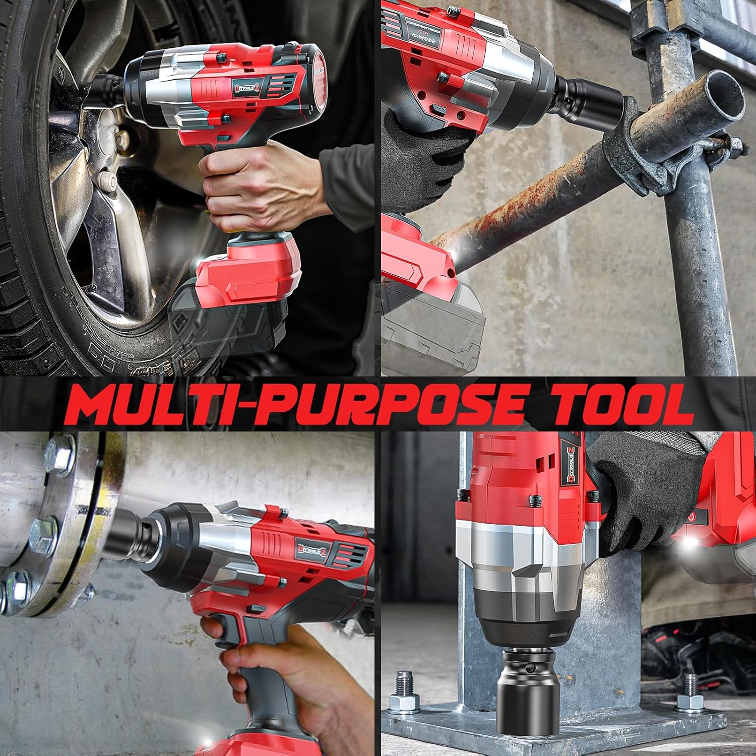 The DIYtoolifz 3/4″ Impact Wrench is a strong tool that works with Milwaukee 18 Volt batteries, even though the battery isn’t included. It can loosen very tight nuts and bolts because it has a huge amount of power, up to 1850 foot-pounds of torque. You can control its speed with four different settings, and it’s built tough for heavy jobs. It also has a smart “auto-stop reverse” feature that stops the tool when a bolt is loose enough. This impact wrench is great for working on cars, trucks, or even for jobs around the house and on mowers.