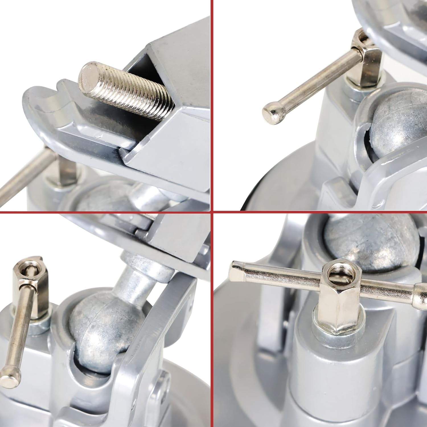 This is a small, silver-colored vise. It has jaws with black rubber pads to hold things securely. A screw with a handle on the side lets you open and close the jaws. The vise has a suction cup base. This lets you attach it to a smooth surface. There’s also a part that allows you to tilt and turn the vise to different angles. This tool is useful for holding small items while you work on them.