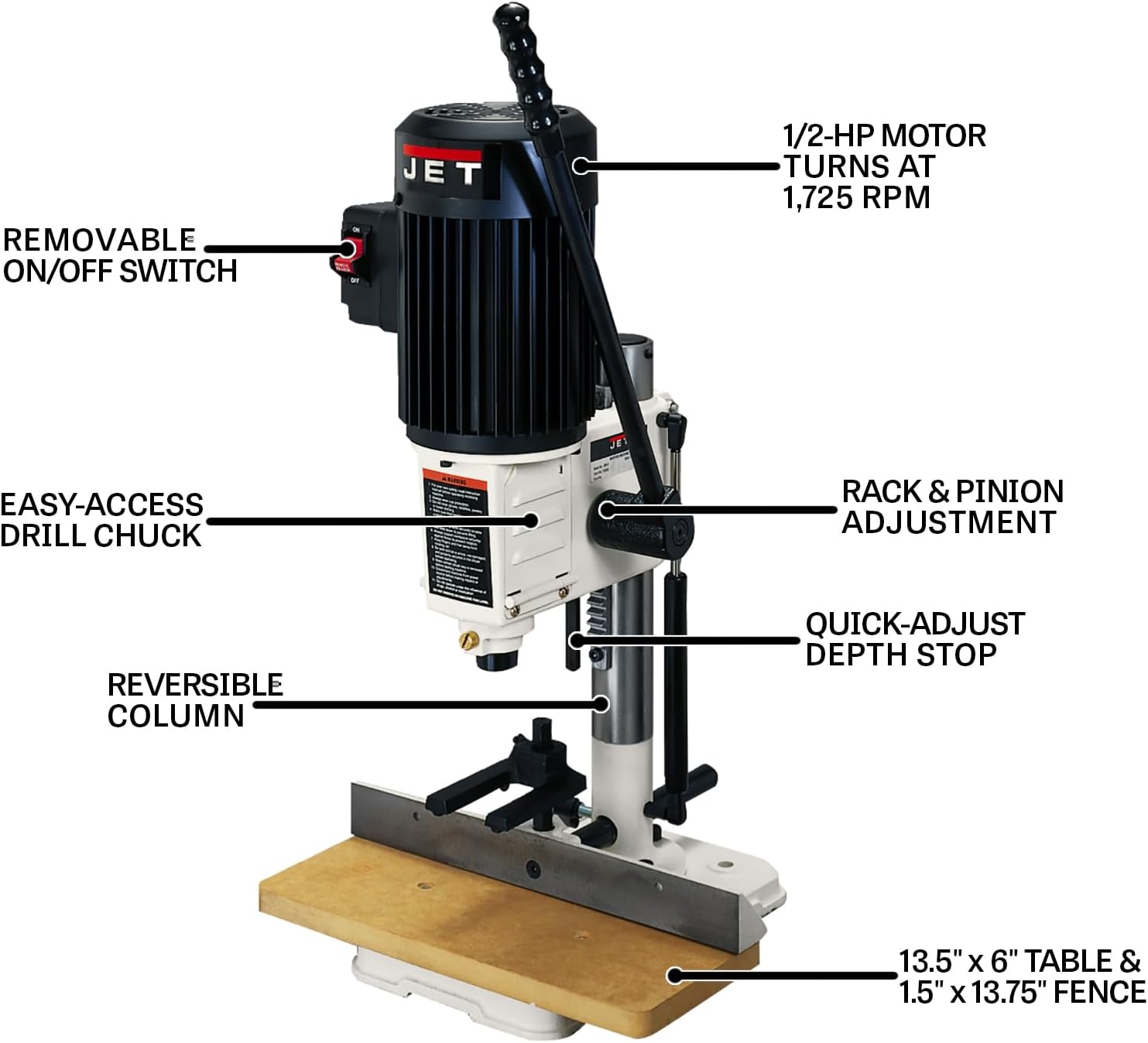 The JET JBM-5 Benchtop Mortiser is a small, easy-to-use woodworking machine designed for making square holes in wood. It runs on regular 115 Volt household power and has a powerful single-phase motor. This tool is perfect for tight spaces because of its compact size, making it a great choice for home workshops or anyone needing a reliable mortising tool for their projects.