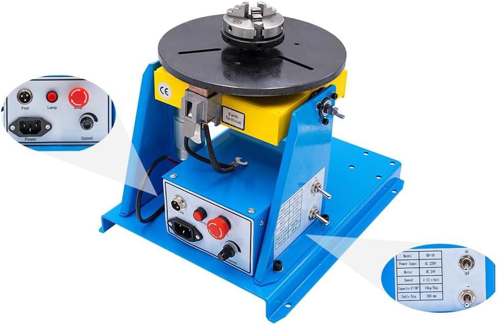 The JINSLU HD-10 is a small welding tool. It’s called a mini rotary welding positioner. This tool can hold up to 10 kilograms (about 22 pounds). It comes with a K01-65 lathe chuck to grip what you’re welding. You plug it into a regular 110 Volt outlet. Its main job is to turn your work as you weld, like a turntable. You can adjust how fast it spins. The surface where you weld can also tilt. This helps you get better welds, especially on small parts.