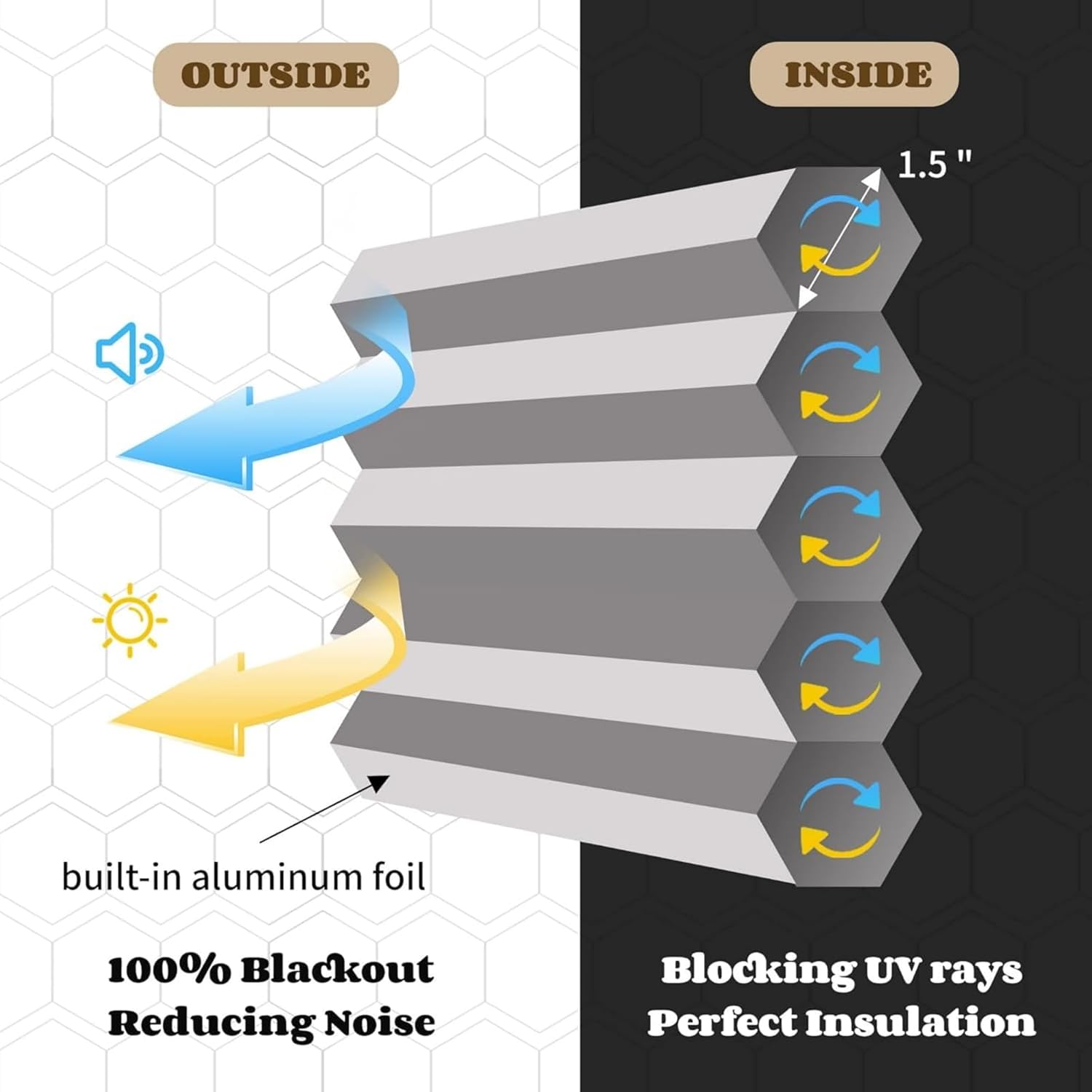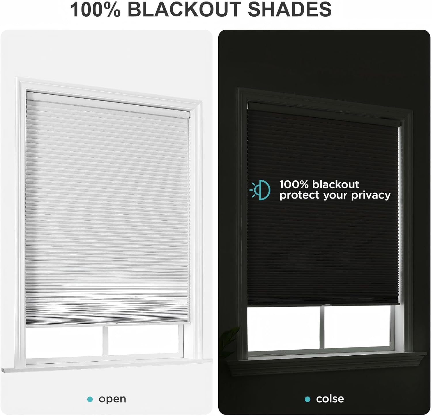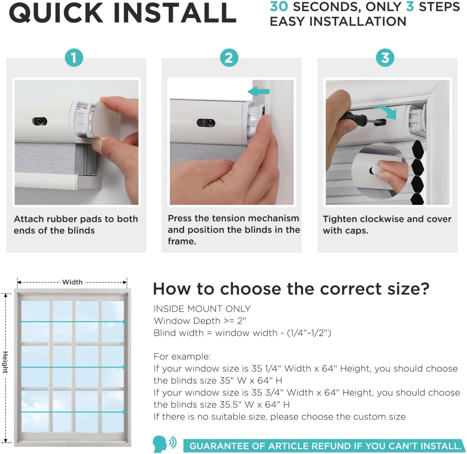 You can easily put up these white Joydeco window blinds. You don’t need any tools or drilling. They are blackout shades, so they’ll make your room dark. The blinds are cellular, which means they have a special design for insulation. They are also cordless, making them safe and easy to use. These blinds are 36 inches wide and 64 inches high, perfect for windows in your home, bedrooms, or even doors.