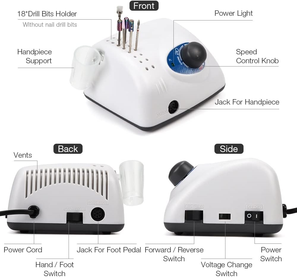 This NSKI nail drill is a powerful tool for nail care. It has a 65-watt motor and can spin its drill bit up to 35,000 rotations per minute (RPM). The drill’s model is Strong 210, and it uses a 105L handpiece with a micro motor for high-speed use. It’s a professional-grade machine, good for all your nail care needs.