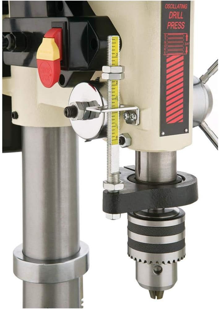 The Shop Fox W1668 is a versatile tool that can drill holes and sand wood. It has a 3/4-horsepower motor and a 13-inch swing, which means it can handle a good range of projects. Because it’s a bench-top design, it’s meant to sit on a workbench. You can use it as a regular drill press to make precise holes, or you can switch it to a spindle sander to smooth out curves and edges. When sanding, it uses an oscillating action to help get a smoother finish. It also has an adjustable depth stop for drilling, a safety switch, and comes with sanding drums. The work table can also tilt, which is handy for angled drilling or sanding.