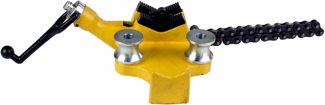 This Steel Dragon Tools BC 510 vise can hold pipes up to 6 inches wide. It can be mounted to a workbench. It uses a chain to grip the pipe tightly. The base is made of strong cast iron. It has a place to rest pipes and a tool to bend them. The chain is made to be strong. The parts that touch the pipe are covered in neoprene. This helps to keep the pipe from getting scratched. The handle to tighten the vise stays connected to the base.