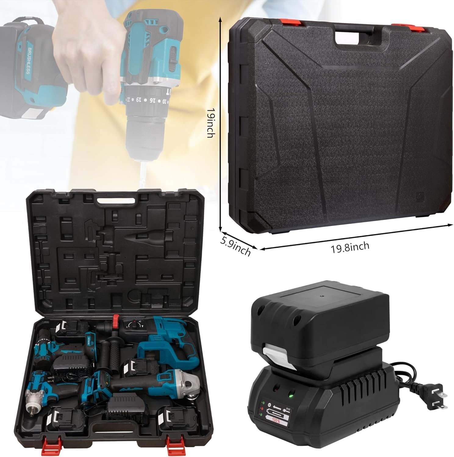 This kit comes with four sets of electric tools that don’t need a cord. You get a drill, an impact driver, a hammer, an angle grinder, and an impact wrench. These tools are powerful and can handle tough jobs. The kit also includes four batteries and two chargers, so you’ll always have power ready.