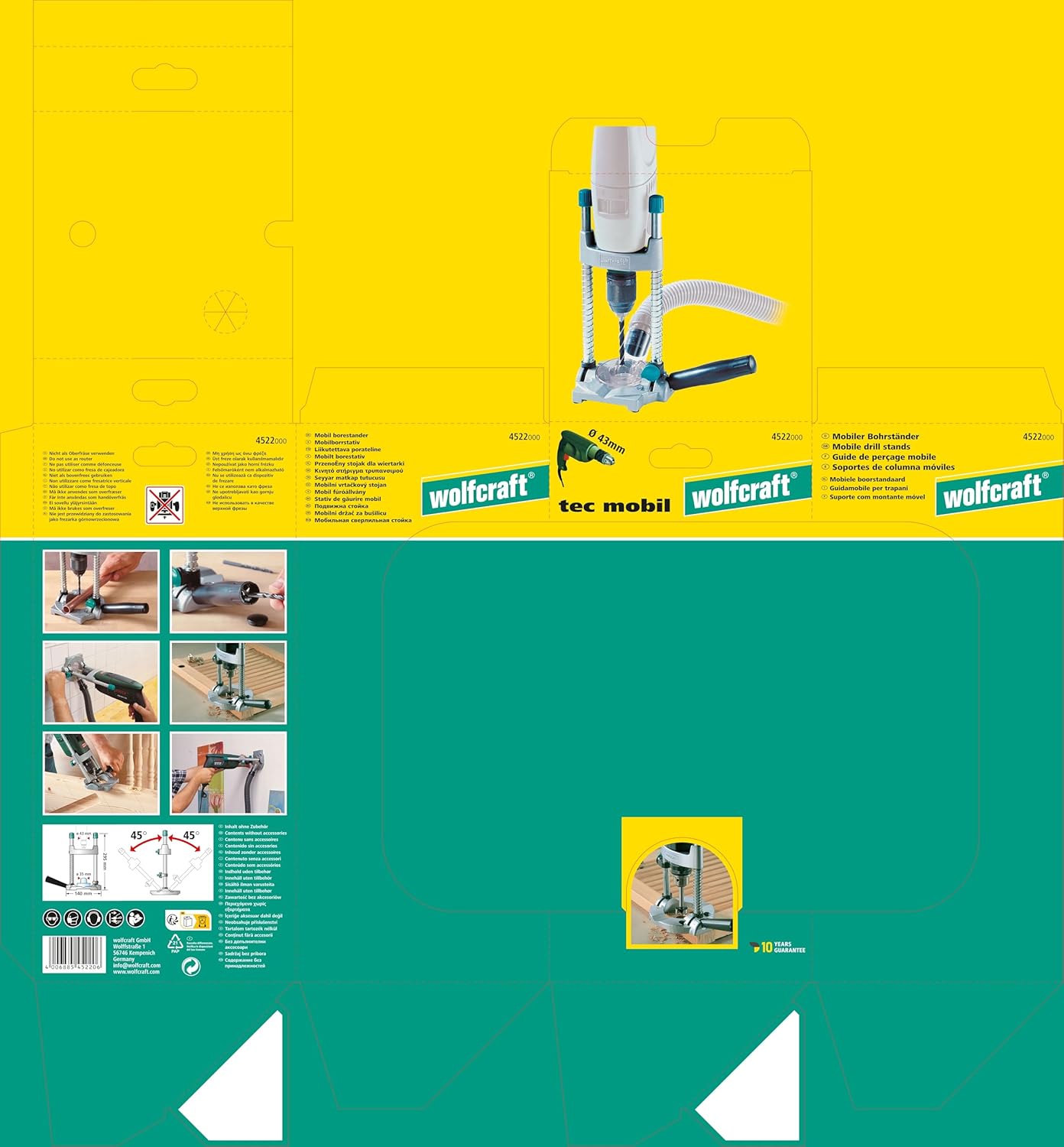 This image shows the Wolfcraft Mobil Drill 4522. It’s a tool that helps you drill straight holes easily. You can attach it to your drill. It has a guide that keeps the drill bit steady. This stops the drill from wobbling. It’s useful for drilling on flat surfaces and edges. The Mobil Drill makes drilling more accurate.