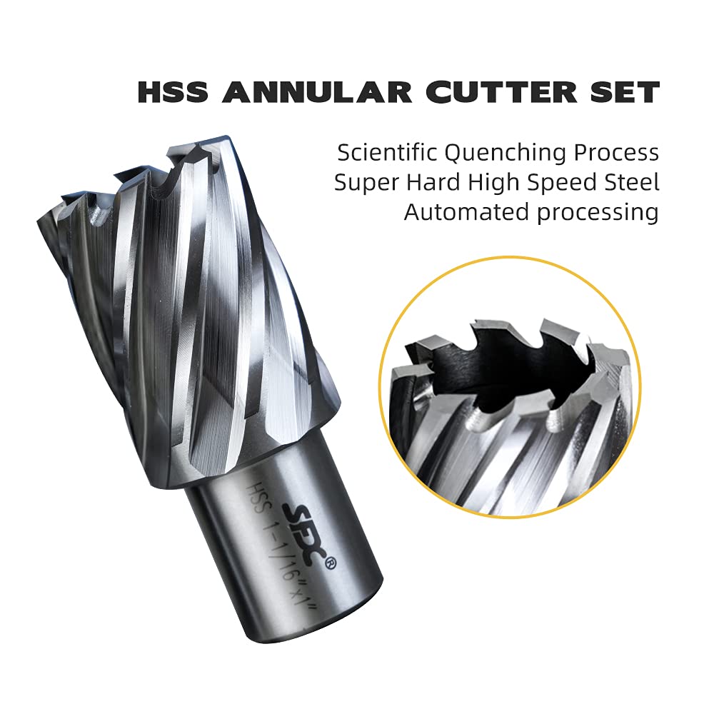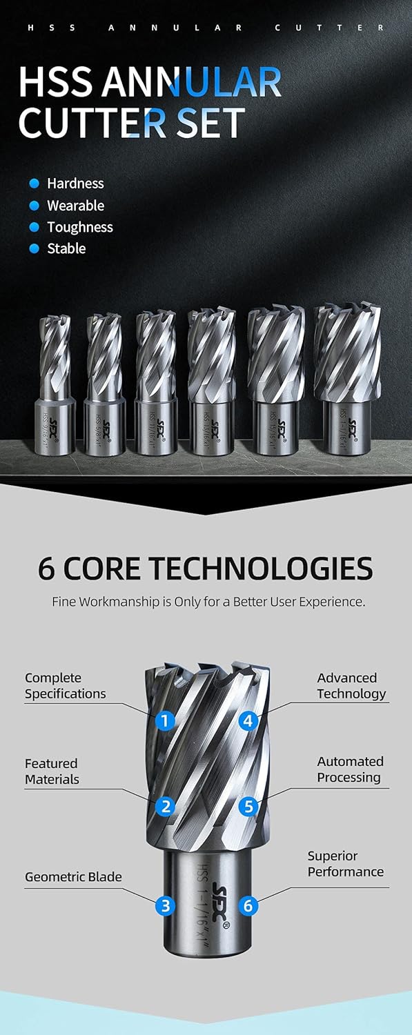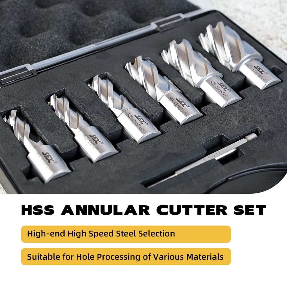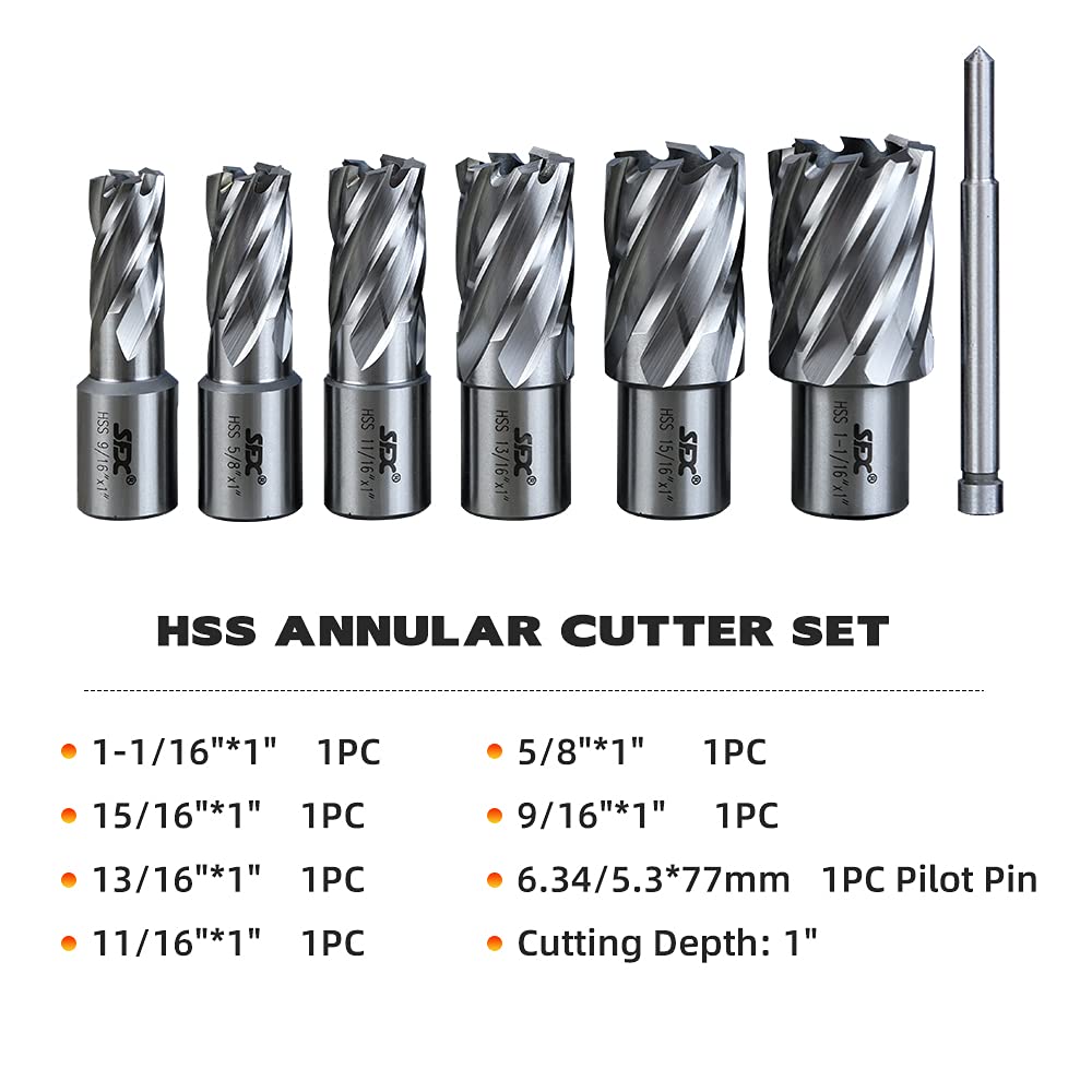 The XINCHENG PRECISION Annular Cutter HSS Set is a 6-piece kit designed for use with a drill press. These annular cutters are made from High-Speed Steel (HSS) and have a 3/4 inch Weldon shank. Each cutter provides a 1-inch cutting depth, with diameters ranging from 9/16 inch to 1-1/16 inch. This standard kit is perfect for making clean, precise holes.